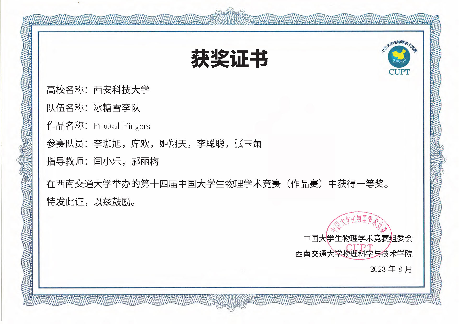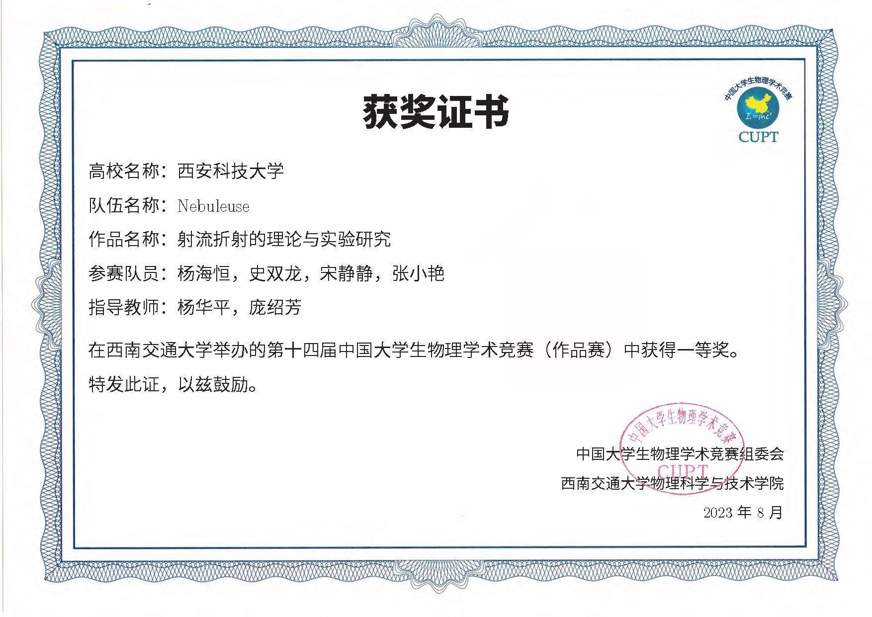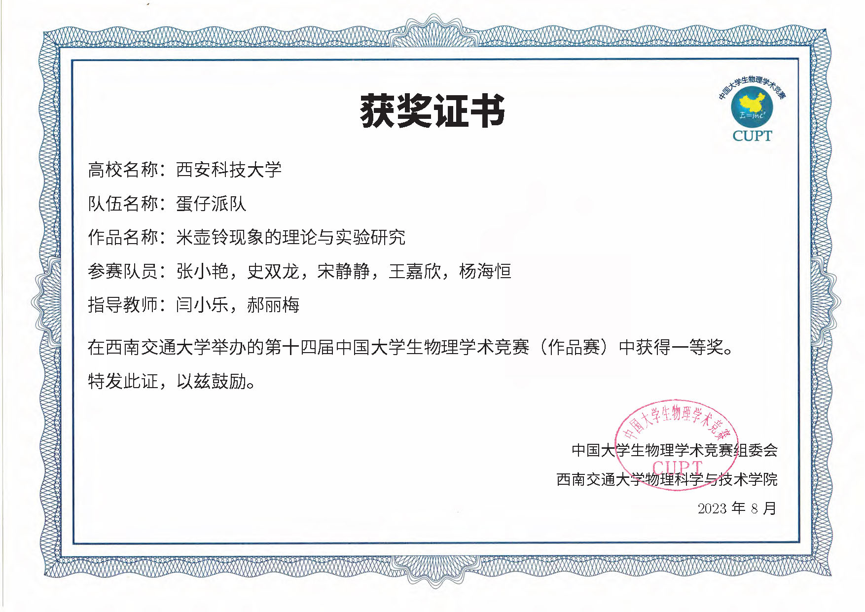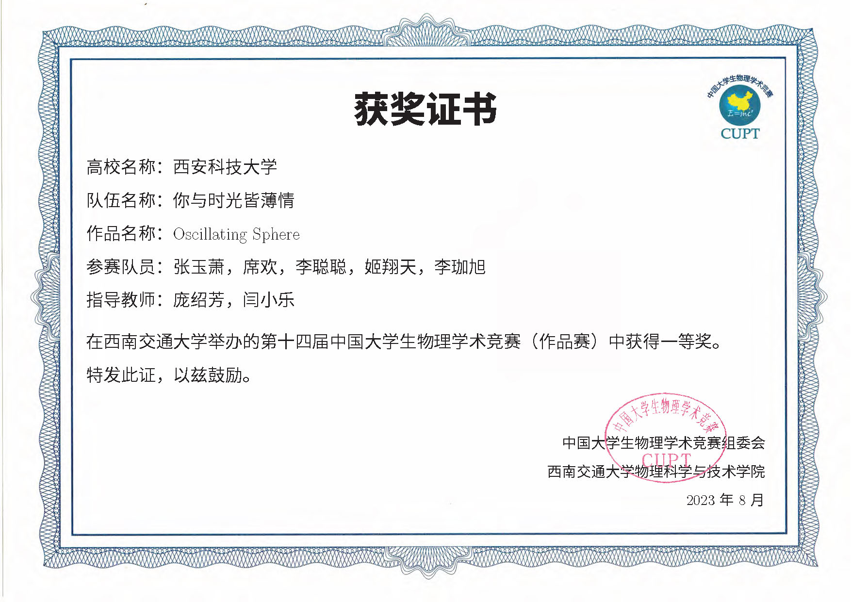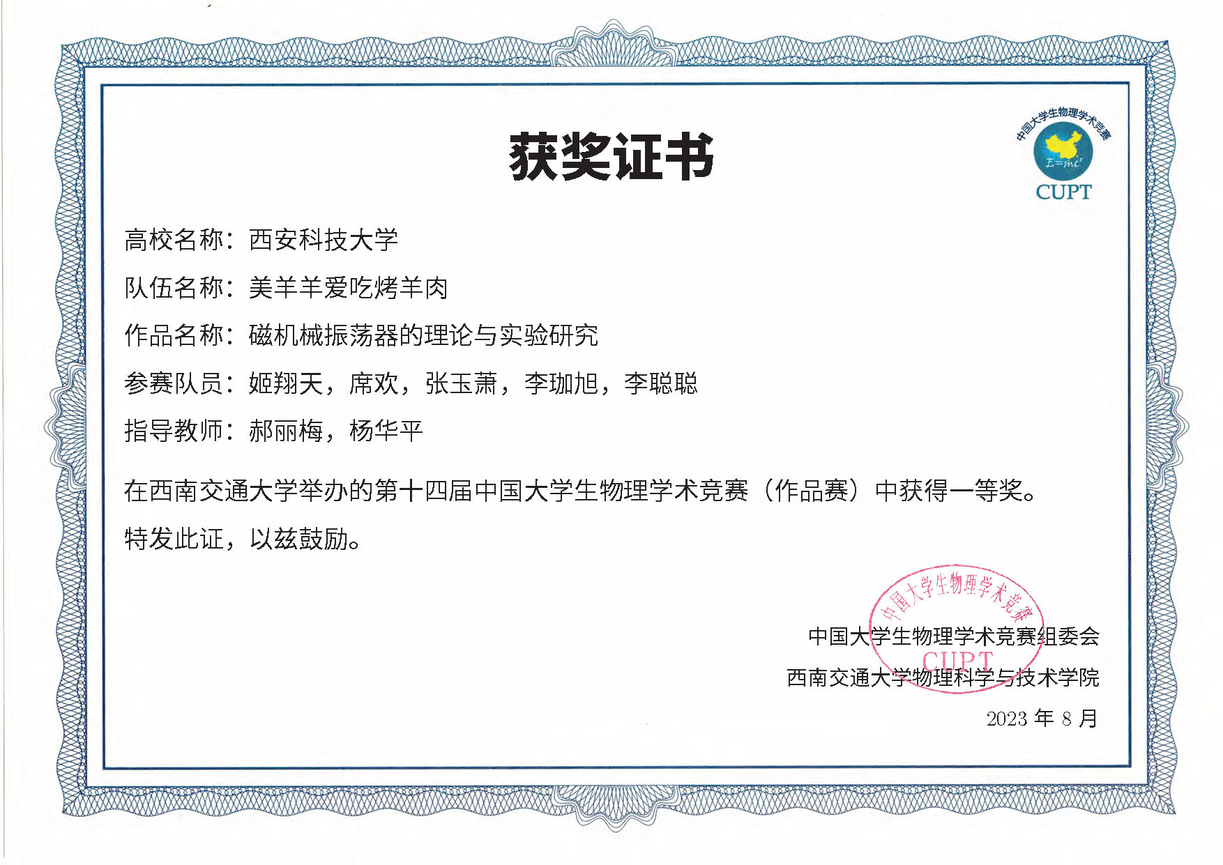8月31日,第十四届中国大学生物理学术竞赛(作品赛)评审工作在西南交通大学落下帷幕,来自全国一百余所高校的448支队伍参与了作品比赛。经过激烈角逐,我校选派的11支代表队荣获国家级一等奖7项,二等奖1项,三等奖3项。
