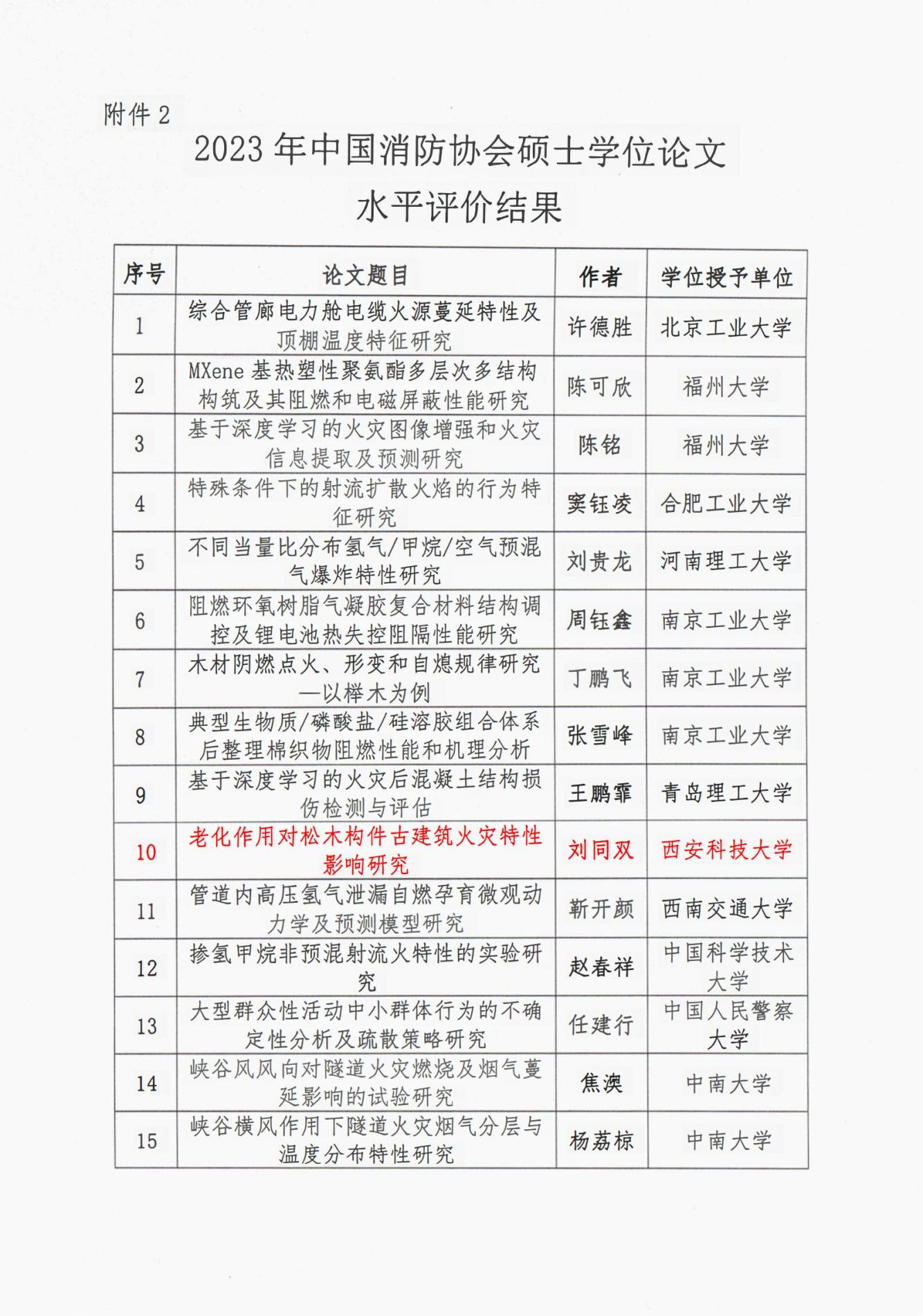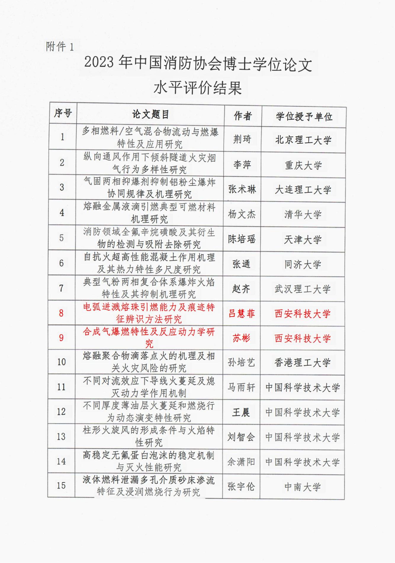 近日,中国消防协会公布了2023年中国消防协会博士/硕士学位论文水平评价结果,安全学院博士研究生吕慧菲的学位论文《电弧迸溅熔珠引燃能力及痕迹特征辨识方法研究》、博士研究生苏彬的学位论文《合成气爆燃特性及反应动力学研究》和硕士研究生刘同双的学位论文《老化作用对松木构件古建筑火灾特性影响研究》,均被认定为具有先进性和创新性,学术水平较高。