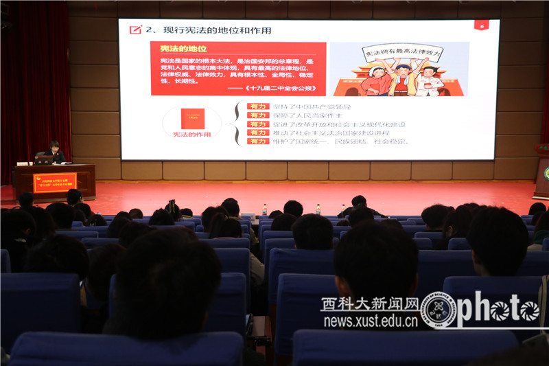 12月4日下午,学校邀请临潼区人民检察院第一检察部副主任“骊雨心荷”未检工作室负责人任兆锦为第十七期“青马工程”大学生骨干培训班学员作《坚定宪法信仰 厚植爱国情怀 做新时代有为青年》的专题讲座,任兆锦从宪法概述及其重要作用,宪法重点内容解读以及维护宪法尊严,保障宪法实施等方面,全方位地讲述了宪法的地位,作用,意义以及其重要性。她把宪法和其法律的关系形象的比喻为交响乐中指挥和其他乐手的关系,“没有统一的指挥,我们的乐队就会显得杂乱无章甚至相互抵触”。她还结合了工作中常见的案例,形象生动地阐释了宪法知识在权益维护中的作用。她希望同学们能够用实际行动在生活中践行宪法,坚定宪法信仰,秉承爱国情怀,作新时代的有为青年。