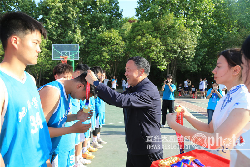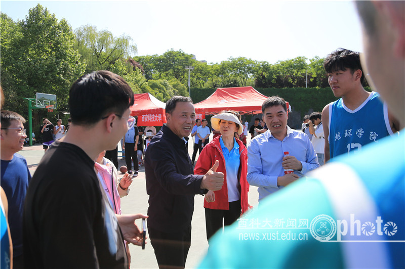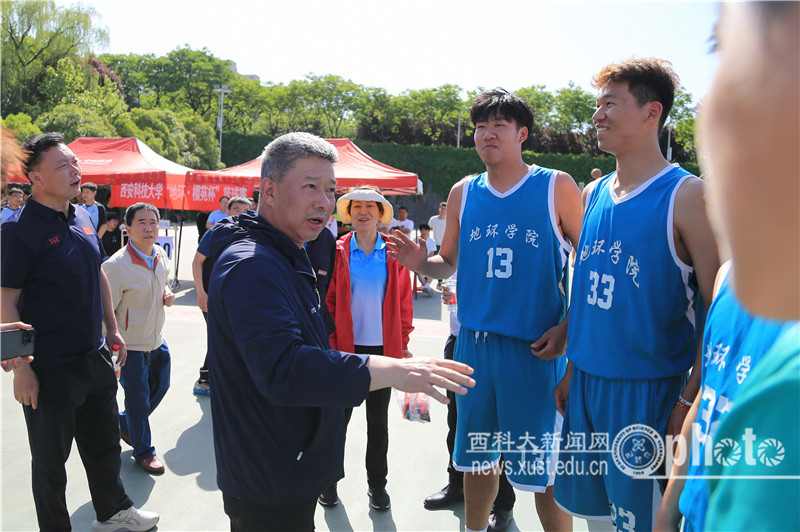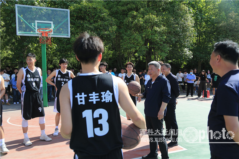 来兴平嘱咐参赛队员在比赛中要注意个人防护和安全,在赛场上展现团队合作精神和精湛技术,大力发扬友谊第一、比赛第二的运动精神,展现西科学子的青春活力。他向即将毕业的篮球队队员赠送球衣,勉励他们在今后的学习、生活中继续发扬“励志图存 自强不息”的学校精神,发扬在校篮球队的团结协作和顽强拼搏精神,在未来人生路上继续奋勇前进。