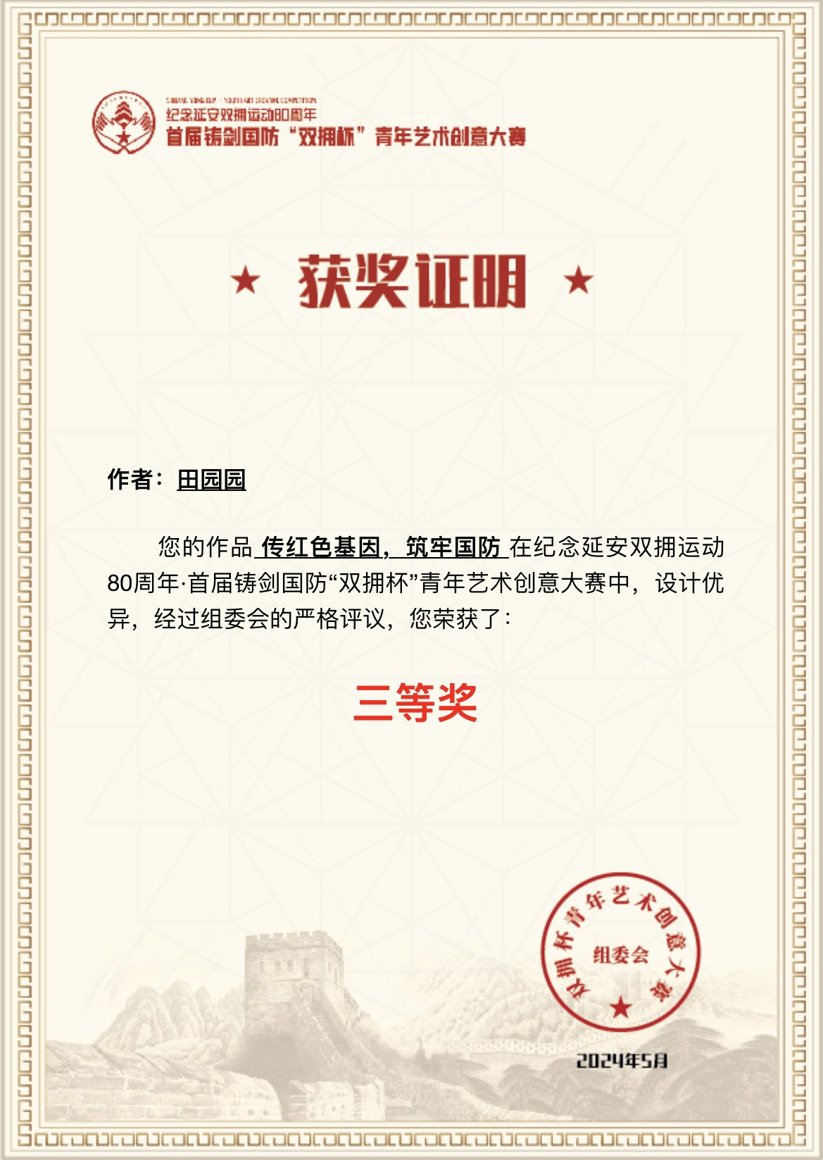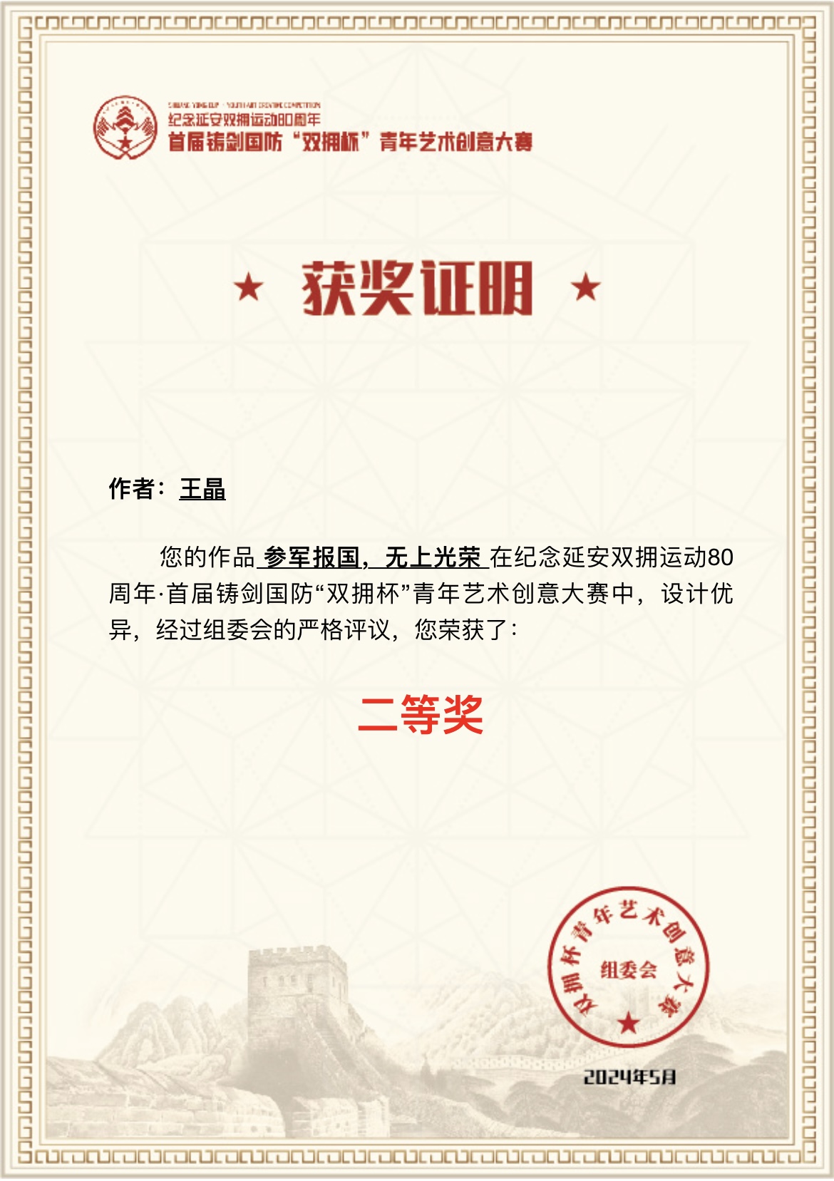 近日,纪念延安双拥运动80周年.首届铸剑国防“双拥杯”青年艺术创意大赛比赛结果出炉,由我校艺术学院美育创新工作室指导选送,舒耀瑄、李浩斌两人作品荣获国家级一等奖,左清秋、王晶两人作品荣获国家级二等奖,田园园、孙唯桐、张硕然三人获得三等奖,教师魏佳赟作品《戍边卫国防》获得教师组一等奖并获优秀指导教师。