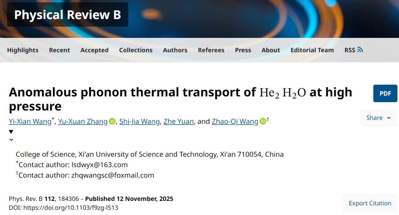 王乙先副教授与王朝棋副教授团队在高压物理研究领域取得重要进展。其关于高压下He2H2O异常声子热输运行为的研究成果,以“Anomalous phonon thermal transport of He2H2O at high pressure”为题发表于凝聚态物理领域权威期刊《Physical Review B》(自然指数期刊)。该成果由王乙先副教授担任第一作者,2023级硕士研究生张宇轩为第二作者,王乙先、王朝棋副教授共同担任通讯作者,西安科技大学为唯一通讯单位。研究揭示了氦-水化合物在高压下的异常声子热输运机制,其显著的声子热传输抑制效应可能会改变冰巨星深层的电导分布和抑制氢-氦相分层,为解释冰巨星内部的多极磁场与异常热流,以及理解其动力学过程与热演化历史提供了关键理论依据。