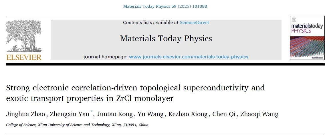 炎正馨教授团队聚焦拓扑器件核心材料研发,在ZrCl单层材料研究中取得关键突破。相关成果以“Strong electronic correlation-driven topological superconductivity and exotic transport properties in ZrCl monolayer”为题,发表于材料科学与应用物理交叉领域TOP期刊《Materials Today Physics》(影响因子9.7)。该成果由2023级硕士研究生赵京华担任第一作者,炎正馨教授为通讯作者,西安科技大学为唯一通讯单位。研究揭示了拓扑保护机制与晶格动力学的深层协同效应,成功实现通过鲁棒边缘模调控ZrCl单层量子态的核心目标,为容错量子比特研发、高灵敏度拓扑器件设计提供了全新材料方案与理论支撑。