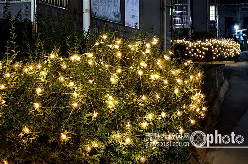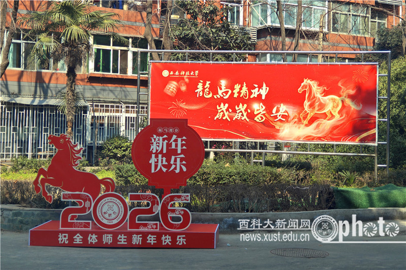 在各家属区,干净整洁的道路两旁也穿上了马年“新衣”,营造出欢乐祥和的节日氛围。绿树上缠绕着灯盏,门廊下挂起了灯笼,马年生肖的特色装扮随处可见,墨字红底的春联衬托出浓郁的节日气氛,喜庆热烈的内容传递着西科大人美好的新春期许和坚定的奋发志向。