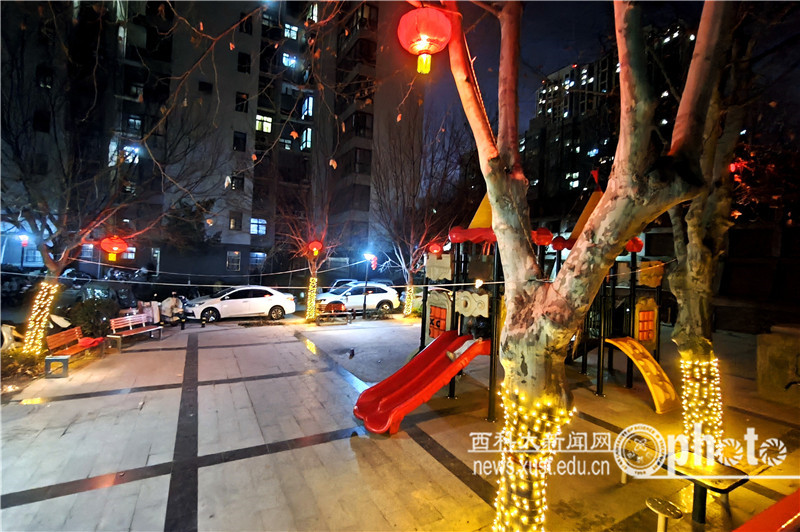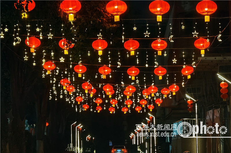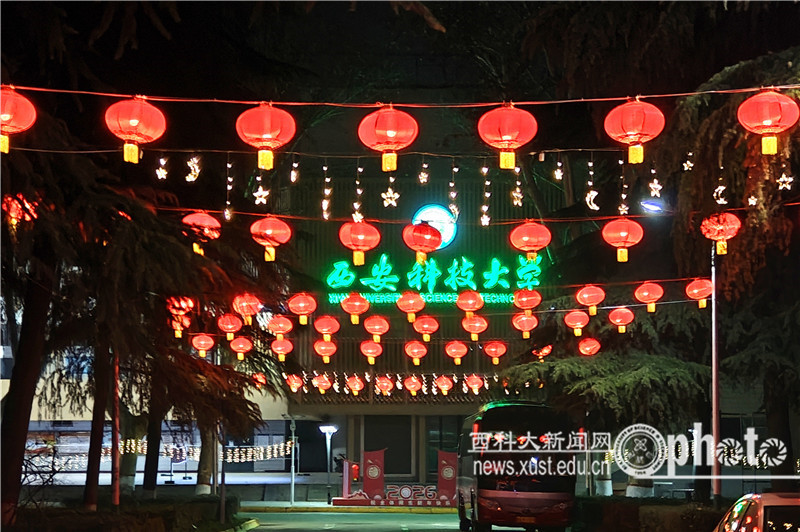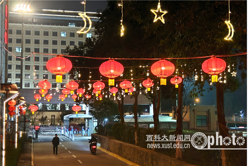 在雁塔校区,鼓舞人心的新春对联张贴在大门两侧,祝福师生新春快乐的主题造型迎门而立。主干道上张灯结彩,高挂的大红灯笼与行道旁的青松翠柏相映成趣。尤其是在夜幕下,路旁的灯串闪烁,营造出璀璨动人的夜色;红灯笼点亮的“连廊”,吸引着师生们纷纷驻足欣赏。极具中国韵味的年节装扮,尽显中华优秀传统文化的底蕴。装扮一新的校园与校外车水马龙的街道交相辉映,为古城新春平添了节日的色彩。