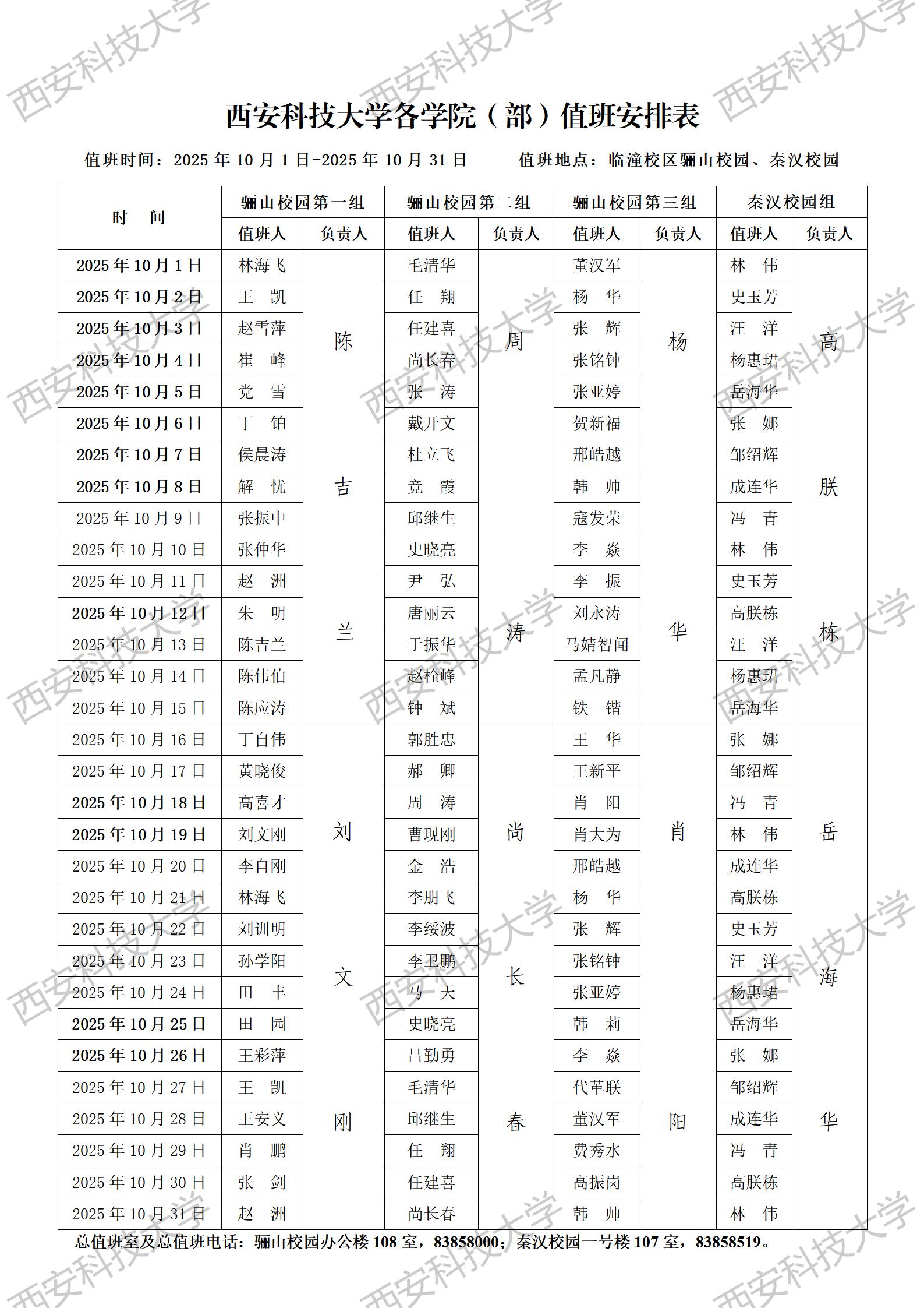 西安科技大学临值班安排表2025年10月1日-2025年10月31日