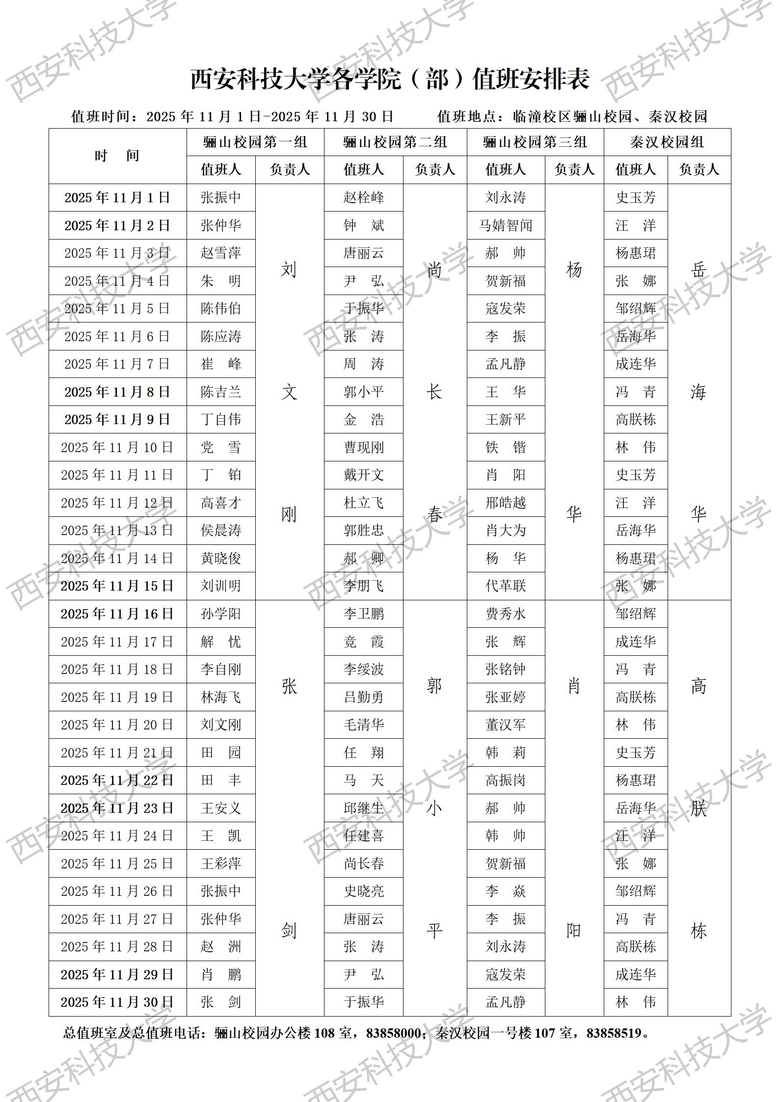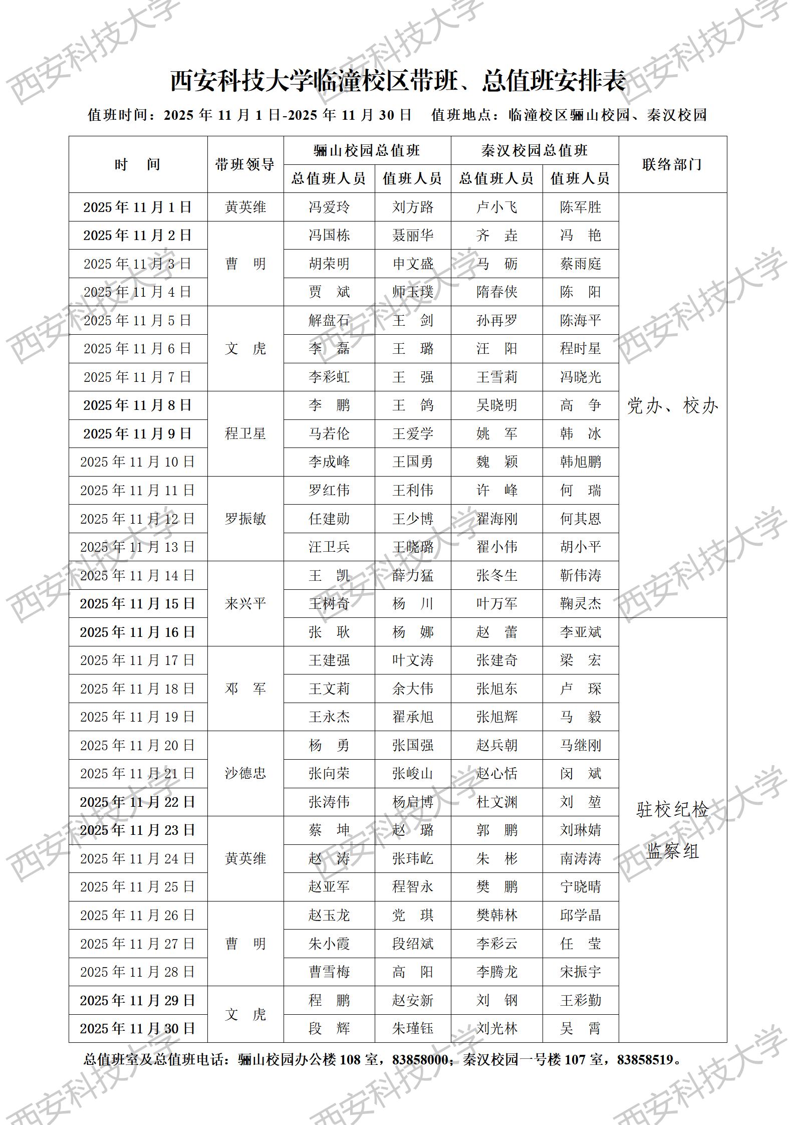 西安科技大学临值班安排表2025年11月1日-2025年11月30日