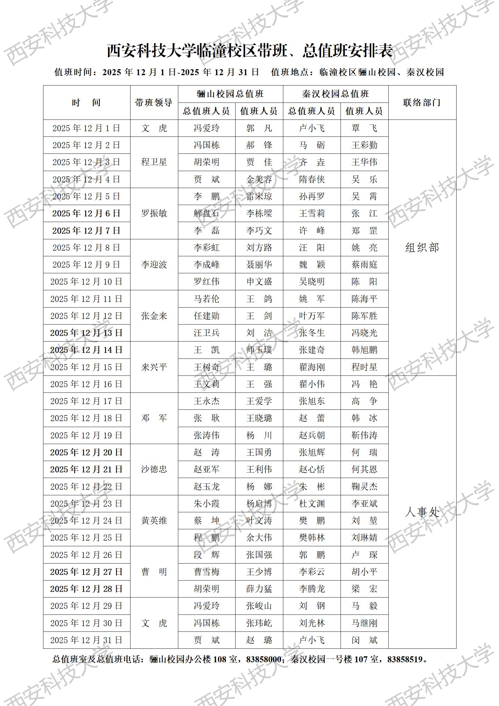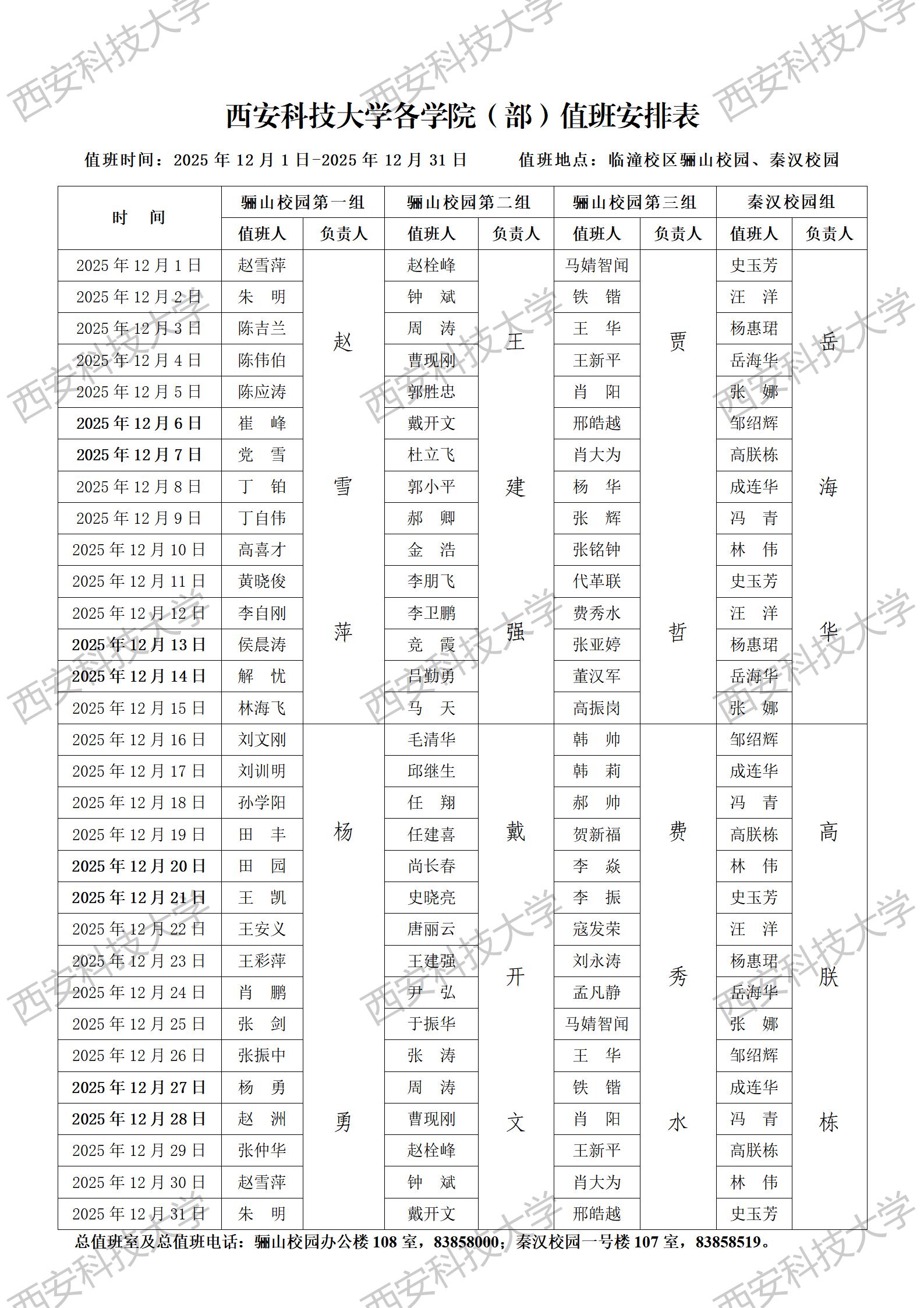 西安科技大学临潼值班安排表2025年12月1日-2025年12月31日